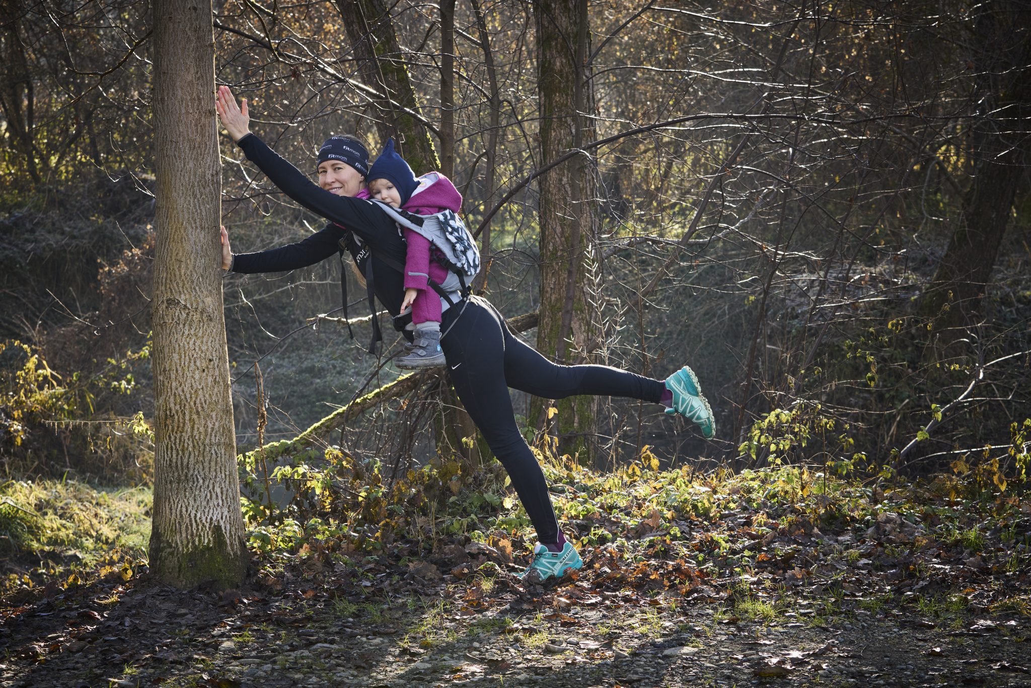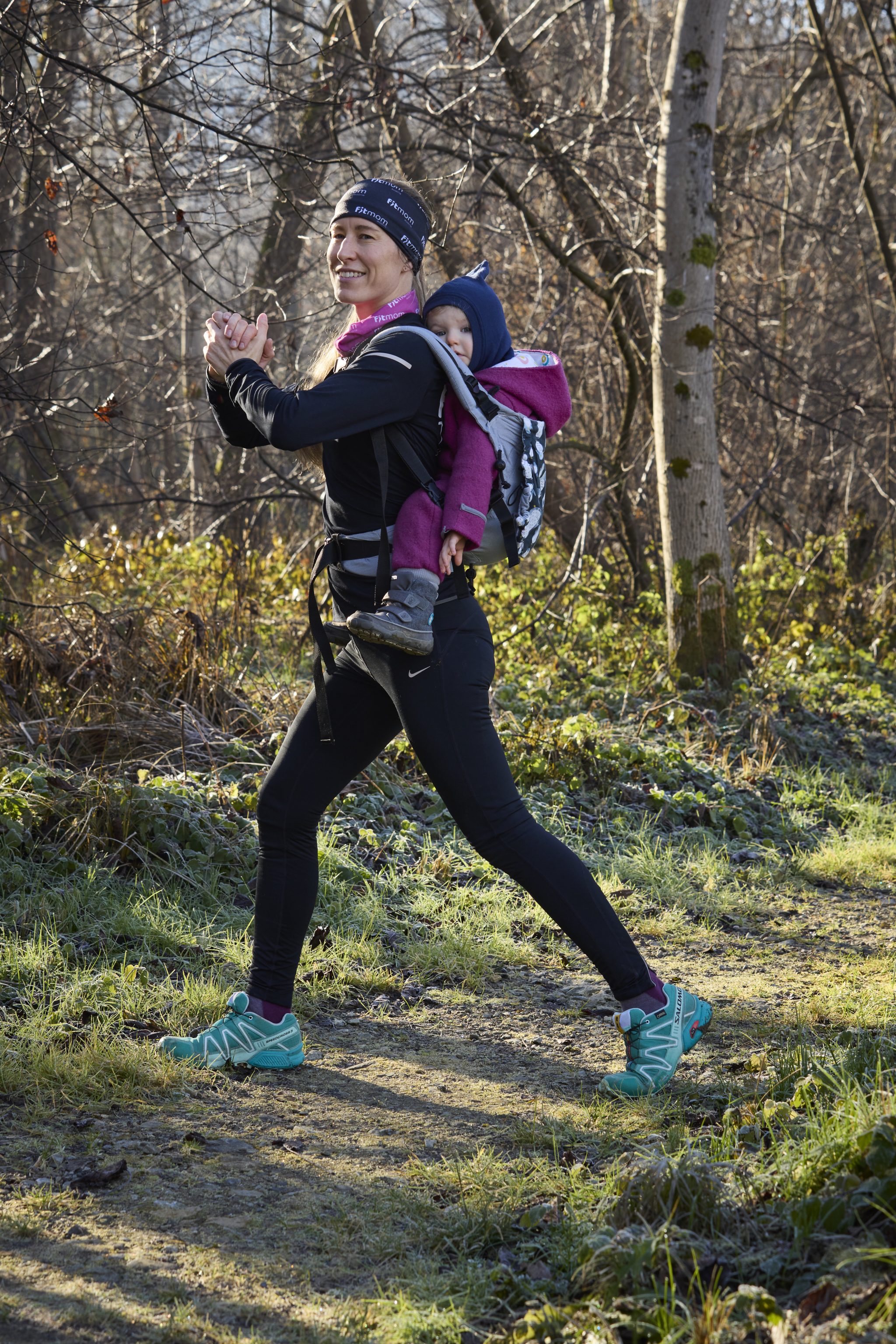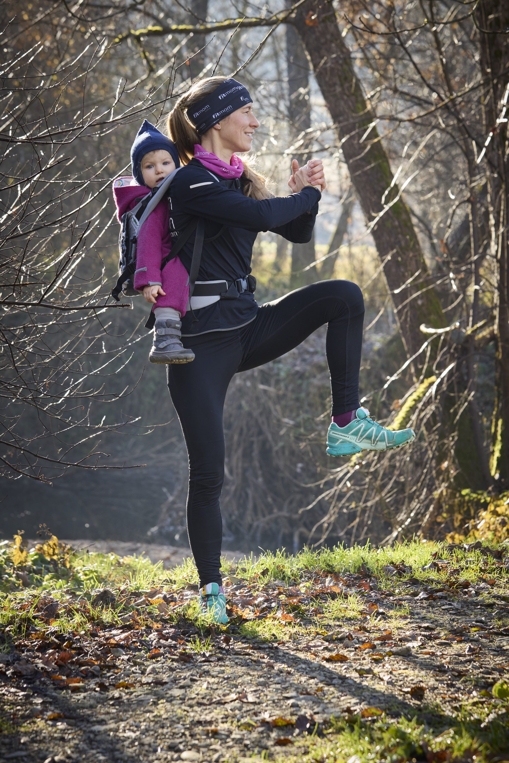 Durch das Tragekind ist es oft eine Herausforderung das Gleichgewicht zu halten, da sich der Körperschwerpunkt ändert. Also Vorsicht im Einbeinstand oder auf instabilem Untergrund – bitte anhalten! Bitte nicht Laufen, Springen oder Hüpfen, da zu hohe Stoßbelastungen auf die Wirbelsäule kommen.
