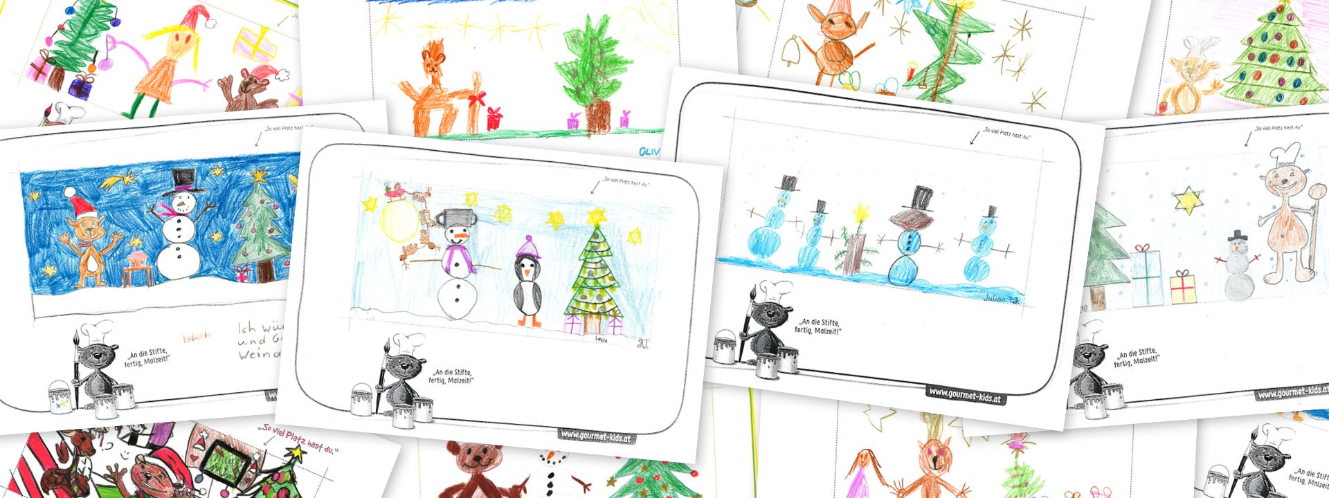 Ein Schneemann mit Schal und Kochtopf als Haube, daneben ein süßer Pinguin, das Maskottchen Gourmelino neben Christbaum und Geschenken oder ein festlich gedeckter Familientisch. Das sind nur einige der vielen Zeichnungen, die Kinderhände gemalt haben, um die Aktion „Licht ins Dunkel“ zu unterstützen. GOURMET Kids hatte zum Malwettbewerb „Zeichnen & Gutes tun“  aufgerufen und jede Zeichnung mit einer kleinen Spende belohnt. 1.500,- Euro sind so durch das Engagement der Kinder für Familien in Not zusammengekommen.