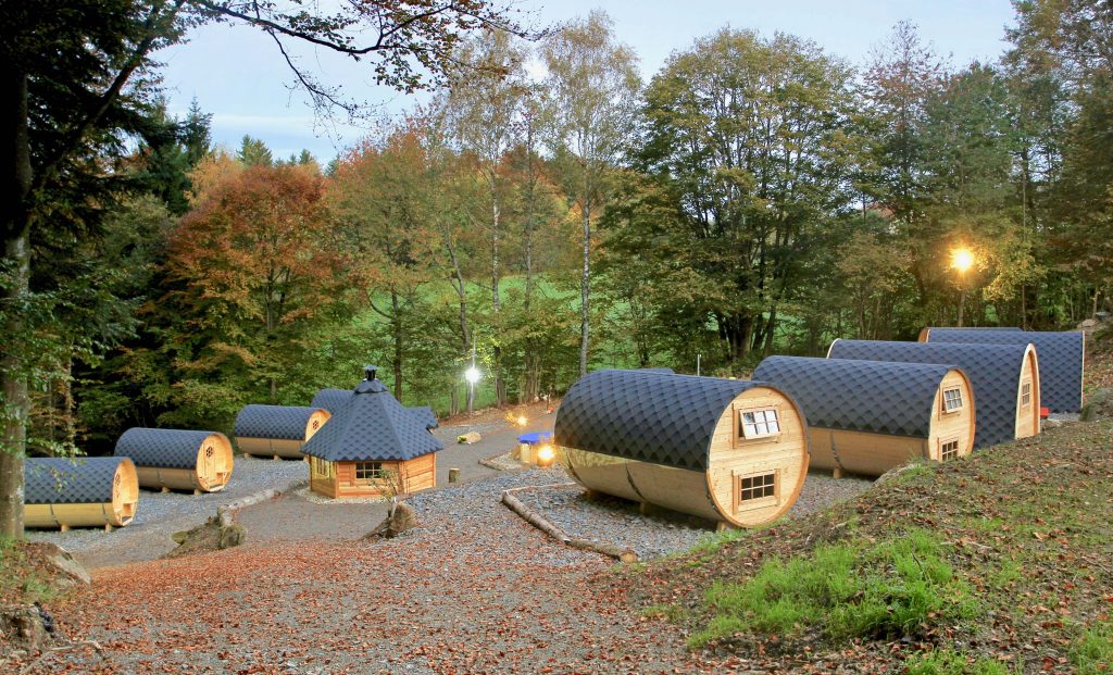 Die derzeit 20 Fässer aus Fichtenholz, die rund vier Meter lang sind und einen Durchmesser von gut zwei Metern haben, sind dank Natursteinheizung kuschelig warm. Zum „Fässer-Dorf“ gehören außerdem eine eigene Grillhütte, zwei beheizbare Badebottiche und – für viele der Höhepunkt des außergewöhnlichen Urlaubserlebnisses in Klingenbrunn bei Spiegelau im Landkreis Freyung-Grafenau – ein Sauna-Fass.