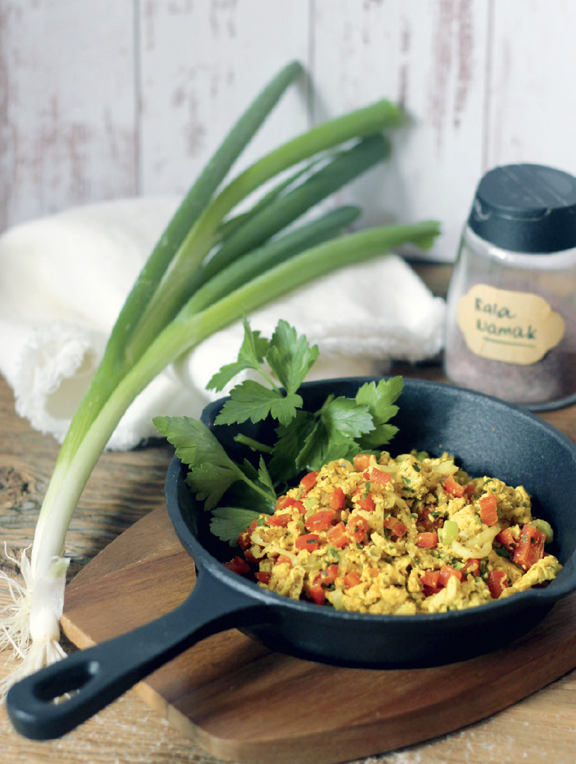Zwiebel fein schneiden und im heißen Öl anrösten. Die Paprika schneiden, Tofu zerkleinern und mitbraten – Wasser und Gewürze dazugeben und weiterbraten. Anrichten und mit Petersilie garnieren.
