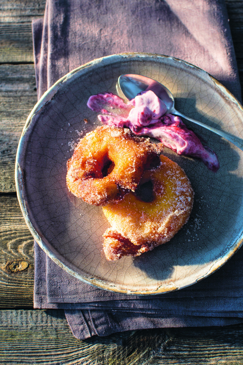 Gebackene Apfelradeln mit Preiselbeerrahm