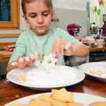 Dann ca. 15–20 Minuten auf mittlerer Stufe backen, bis die Kekse leicht braun an der Oberfläche sind. Herausnehmen und unterschiedlich dekorieren.