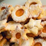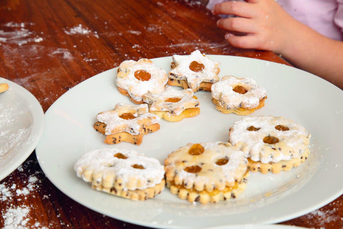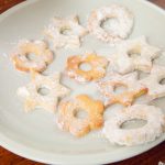 Nach kurzem Überkühlen auf die ungelochten Scheiben ein Häufchen Marmelade geben, die gelochten Scheiben mit Zucker-Vanillezucker-Gemisch „übersieben“ und jeweils zwei zusammensetzen. Die Marmelade soll ein wenig aus den Löchern „herausgedrückt“ werden.