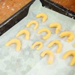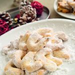 Die Kipferl nun etwa 3 Minuten kühlen lassen. Dann in die vorbereitete Puderzuckermischung legen und von allen Seiten darin wenden. Sind sie jetzt noch zu warm, zerbrechen sie sehr leicht; sind sie zu kalt, haftet der Puderzucker nicht mehr gut. Am besten immer wieder probieren, ob sie schon fest genug sind.