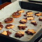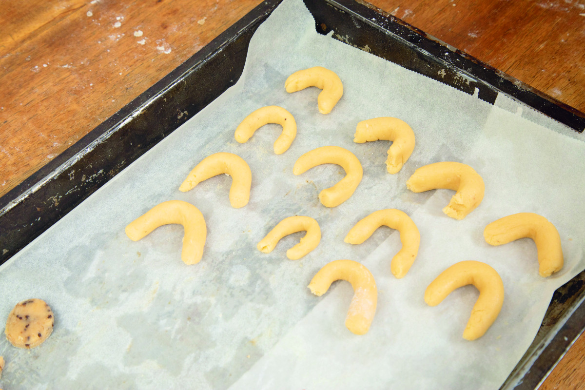 Backrohr auf 180 Grad Heißluft vorheizen. Den Teig ca. 2–3 mm dick ausrollen und mit dem passenden Torteneisen (wichtig: 3 Löcher für die Oberseite) Scheiben ausstechen. Die Scheiben auf ein mit Backpapier ausgelegtes Backblech legen und in die Mitte des vorgeheizten Backrohres schieben und ca. 10–12 Min. hellbraun backen.