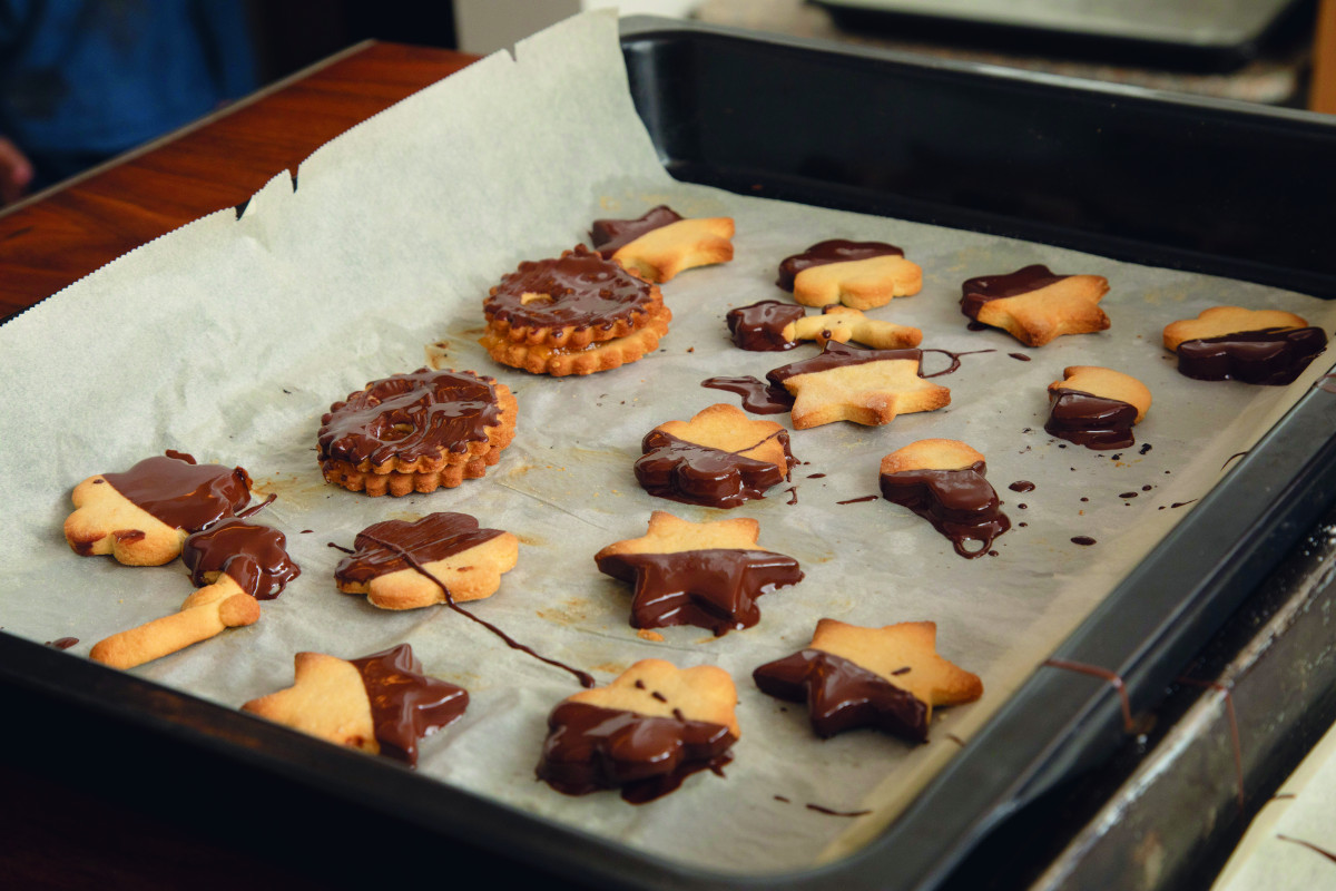 Kochschokolade langsam unter viel Rühren am Herd erhitzen, evtl. etwas Milch zusetzen, aber nicht zu dünnflüssig werden lassen. Unterseite der Kekse mit Hilfe eines Spritzsacks mit Marmelade bestreichen, Oberseite drauflegen, das Keks-Sandwich halb in Schokolade eintauchen. Auf einem Teller trocknen lassen. Ein Tipp: Wenn man Schokosplitter in den Teig mit einknetet, schmecken die Kekse gleich noch einmal so gut!