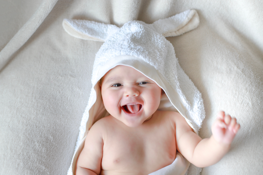 Adorable,Newborn,Baby,Wrap,By,White,Rabbit,Towel,With,Smiling