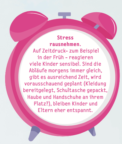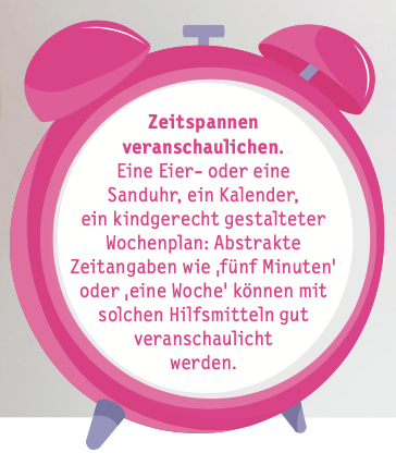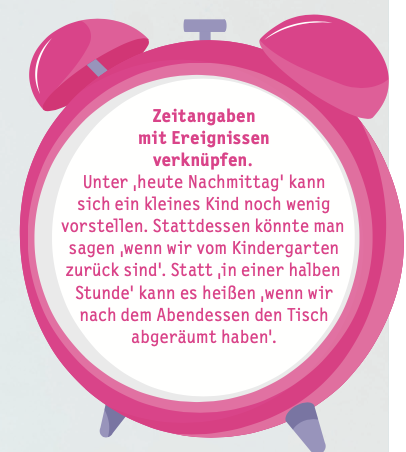 „Erwachsene können ganz bewusst die alltäglichen Zeit-Erfahrungen, in denen Zeitbegriffe wie ‚schnell‘, ‚in zehn Minuten‘ oder ‚später/nach- her‘ vorkommen, eindrücklich und zuverlässig gestalten. Diese Begriffe sind nämlich erst einmal nur hohle Worthülsen, die nach und nach mit Bedeutung gefüllt werden müssen“, sagt Iris van den Hoeven. Wie kann das aussehen? Wenn Papa ankündigt, dass er in fünf Minuten Zeit für die Gute-Nacht-Geschichte hat, sollten es auch tatsächlich fünf Minuten sein. Um zu veranschaulichen, wie lange eine Zeitspanne dauert, können visuelle Timer wie eine Sand- oder Eieruhr hilfreich sein, ein Lied oder die Anzahl von Nächten, die ich noch schlafen muss, bis endlich der Geburtstag da ist. Noch ein Tipp von Iris van den Hoeven: „Gut begleiten können wir auch über handlungsbegleitendes Sprechen, zum Beispiel indem wir sagen ‚Jetzt waren wir einkaufen, später besuchen wir Oma.“