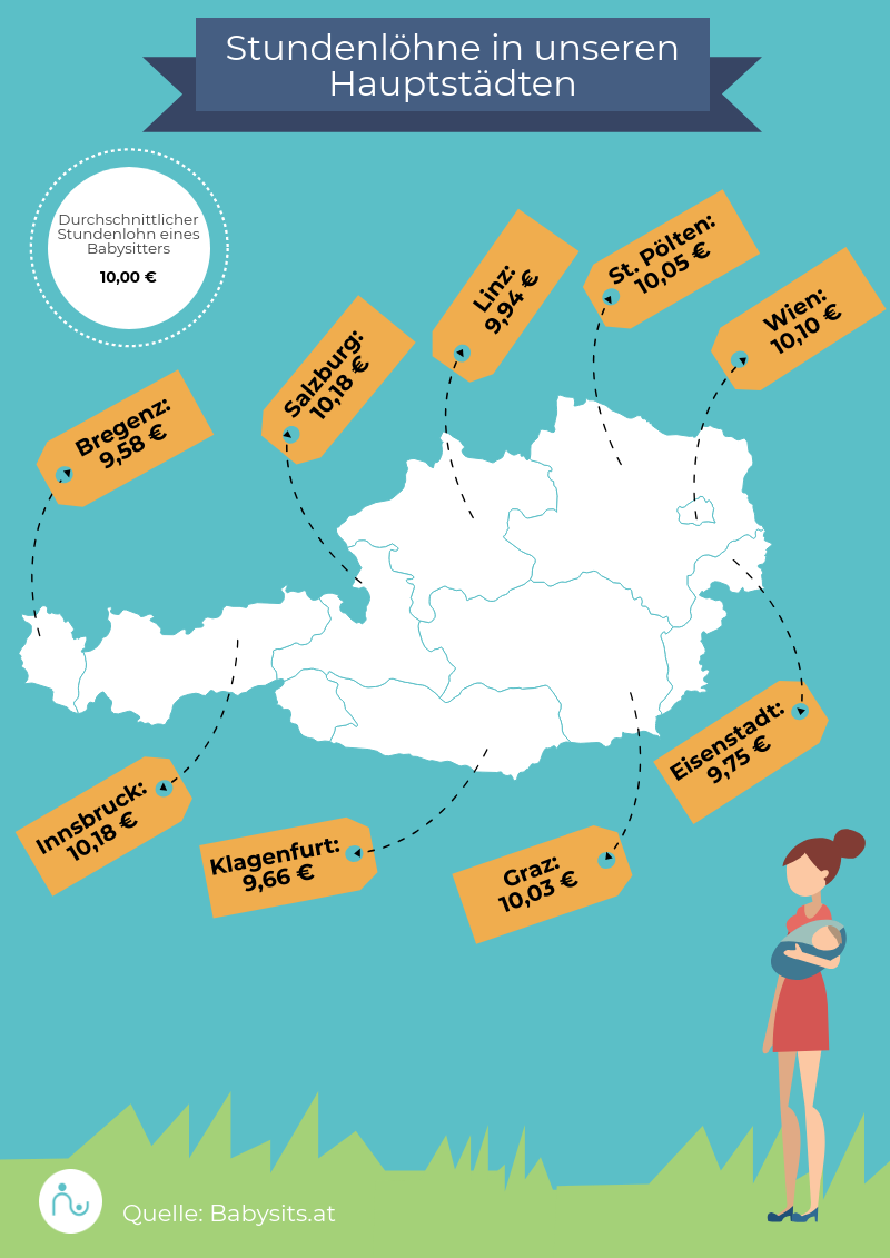 Ein erster Anhaltspunkt für den Lohn sind die Durchschnittslöhne auf Babysits. Das ist natürlich von Land zu Land unterschiedlich. In Österreich erwarten die Babysitter momentan durchschnittlich € 10,00 pro Stunde für das Betreuen von einem Kind. Basierend auf diesem Durchschnitt könnt ihr euch ein erstes Bild machen was ihr verlangen oder zahlen sollt. In dieser Infografik seht ihr zusätzlich die Durchschnittslöhne für alle Landeshauptstädte in ganz Österreich. Beachtet jedoch, dass diese nicht der einzige Indikator für eine angemessene Bezahlung sind. Nach der Infografik geht es mit den restlichen Tipps weiter.