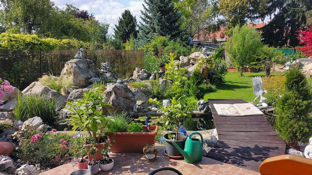Urlaubsfeeling im eigenen Garten. In Floridsdorf könnte man in diesem Garten dank der vielen Pflanzen, kunstvollen Steinfiguren und eines Teichs samt Brücke beinahe denken, man sei im Urlaub.