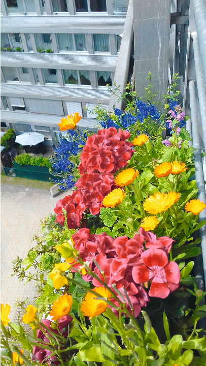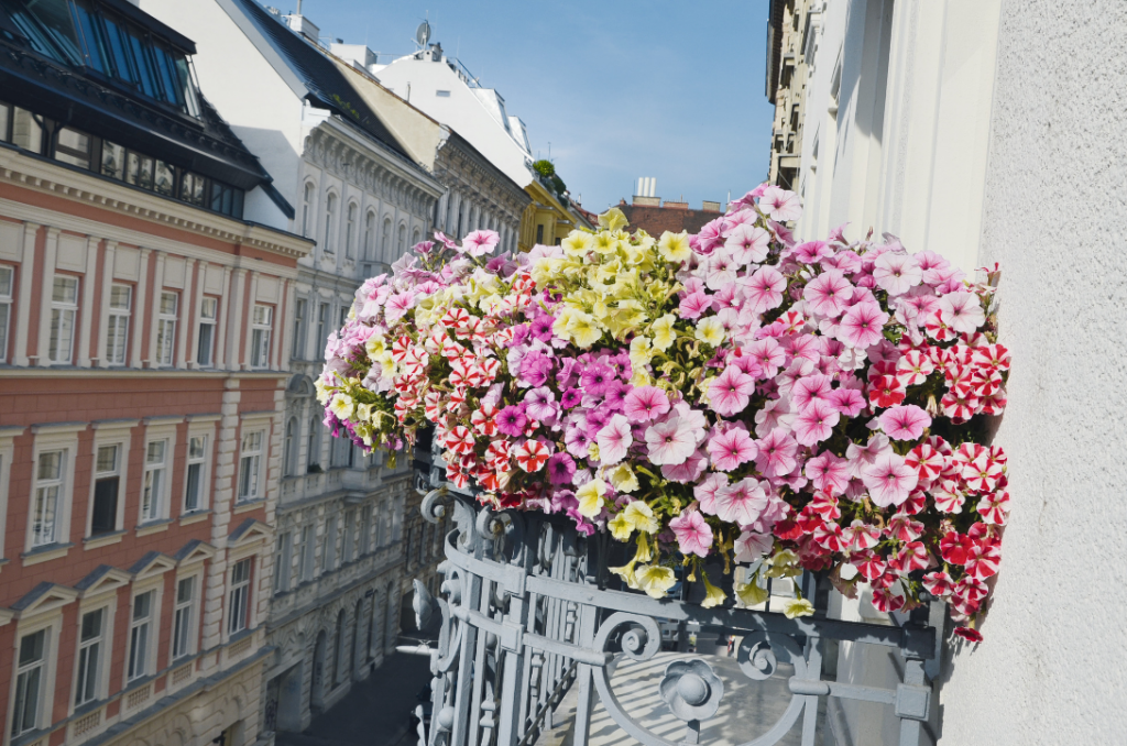 Üppig mit Blumen und Blühsträuchern bepflanzte Balkone sind die knallbunten Leuchttürme einer lebenswerten Stadt, in der auch Bienen und andere nützliche Insekten reichlich Nahrung finden.