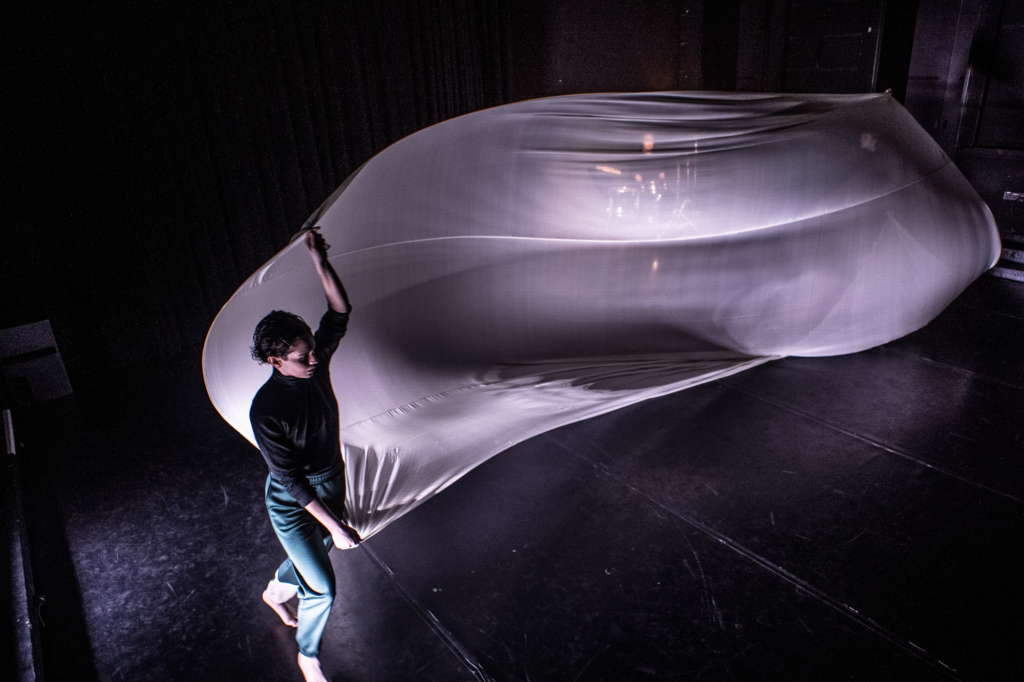 Ein Tanz mit einem riesigen Tuch, das sich immerfort verwandelt: Aus kleinen Wellen wachsen Meereswogen und Wirbelstürme werden zu luftigen Skulpturen. Ein Anschwellen und Abflauen, Herausschälen und Erwachsen. Wir hüllen uns in einen Kokon und warten auf die neue Haut: Wo fängt die Welle an, wo hört die Falte auf? Aus Atem wird Bewegung – und dann flattern wir davon.