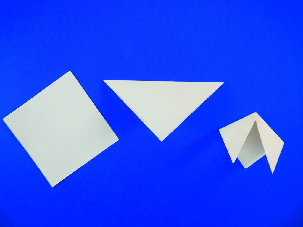 1. Falte die weißen Papier-Quadrate zu Dreiecken. Klappe nun die Ecken links und rechts leicht schräg nach unten (siehe Foto) – schon ist die Blüte fertig!