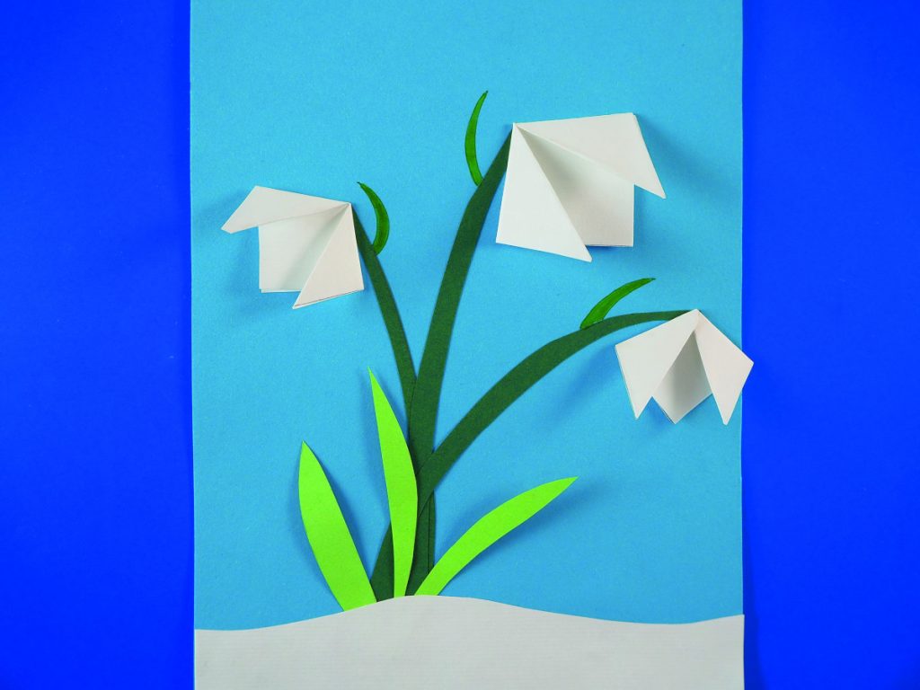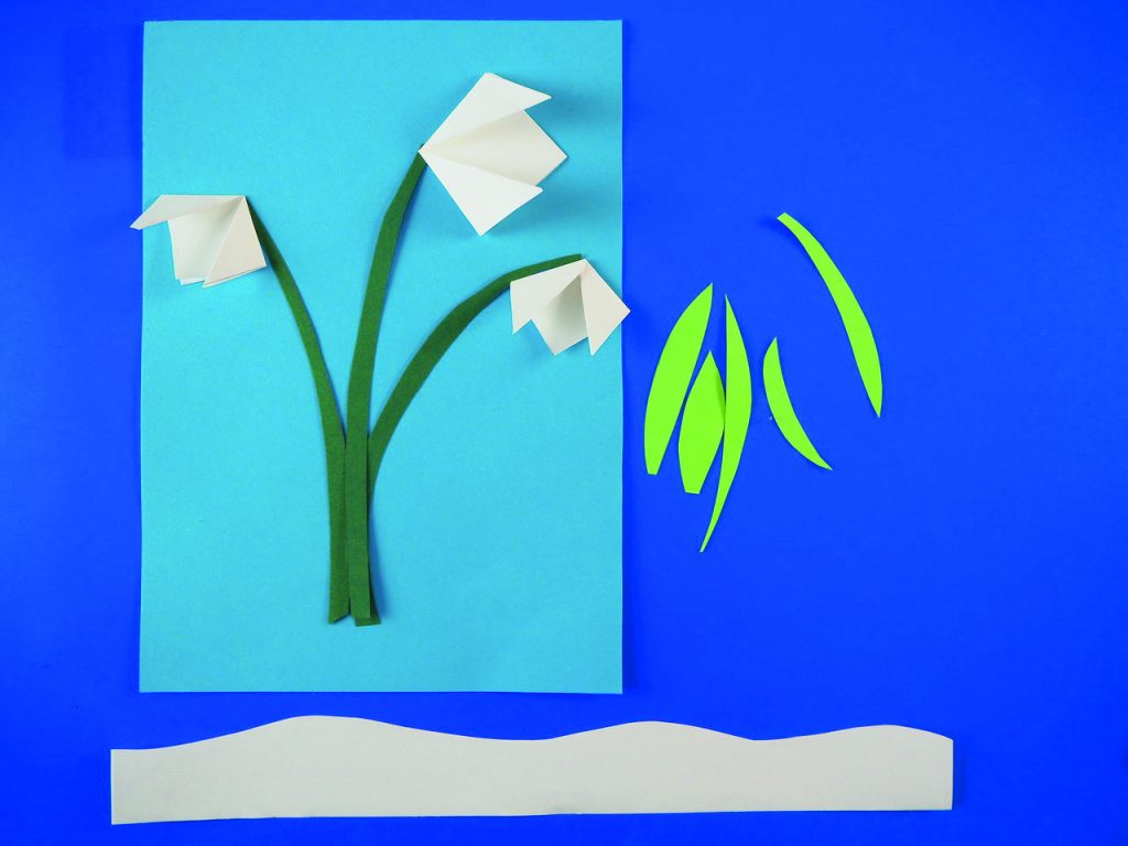 2. Schneide aus grünem Tonpapier Stiele und Blätter aus. Verwende weißes Papier für den Schnee, aus dem dein Schneeglöckchen wächst.