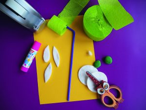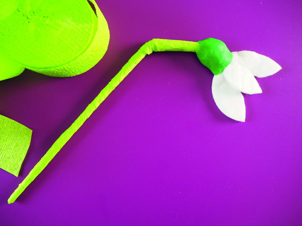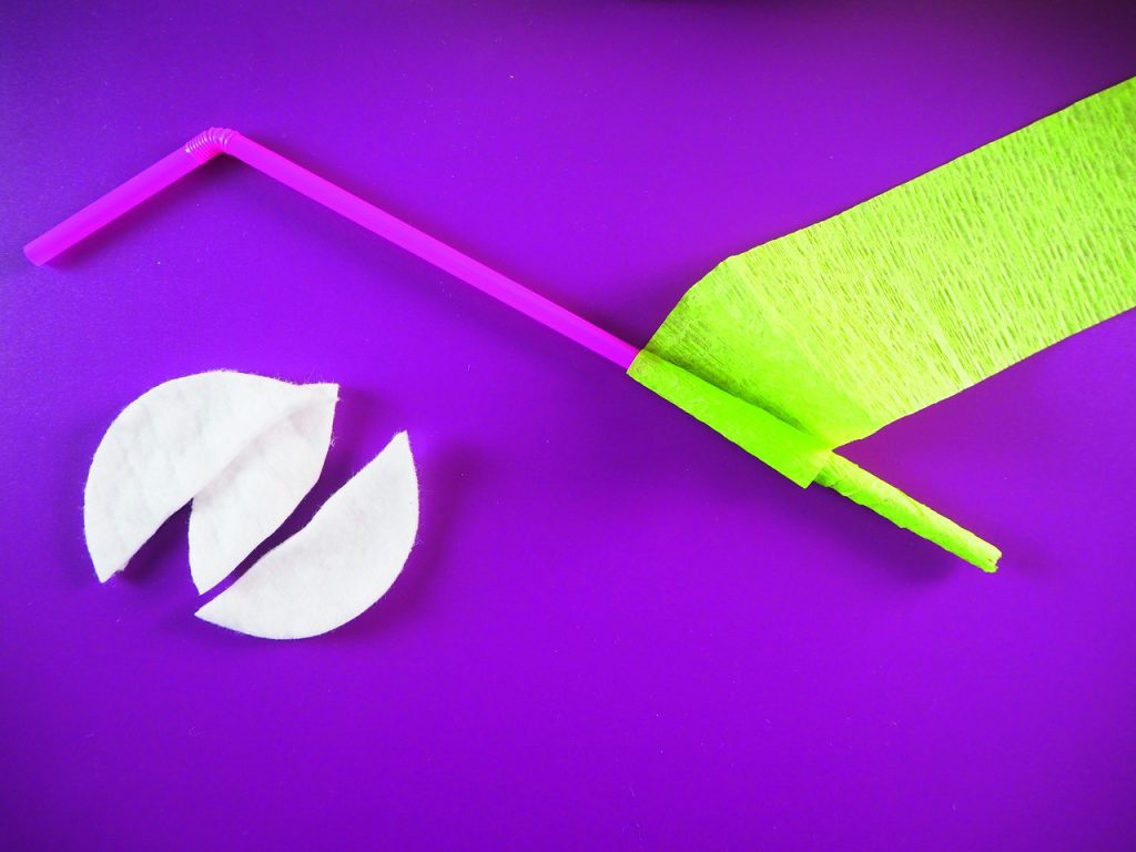 2. Umwickele den Trinkhalm mit grünem Krepp-Papier (oder verwende einfach einen grünen Halm). Zum Befestigen reicht ein kleines Stück Klebeband.