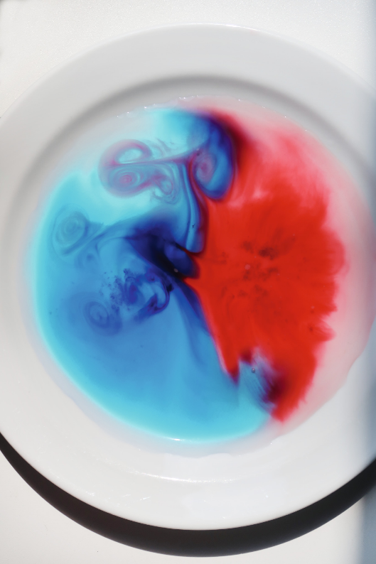 Der Zucker löst sich im Wasser auf und mit ihm verrinnt auch die Farbe. Wenn du zwei verschiedenfärbige Stück Würfelzucker verwendest, entstehen so tolle Bilder: Beobachte mit einer Lupe, wie die Farben anfangs getrennt bleiben und sich dann nach und nach vermischen!