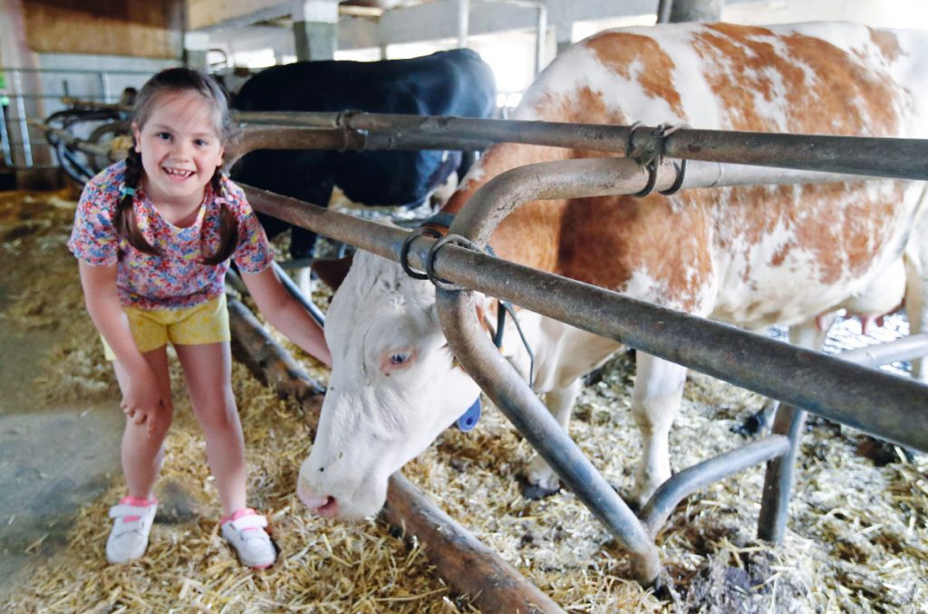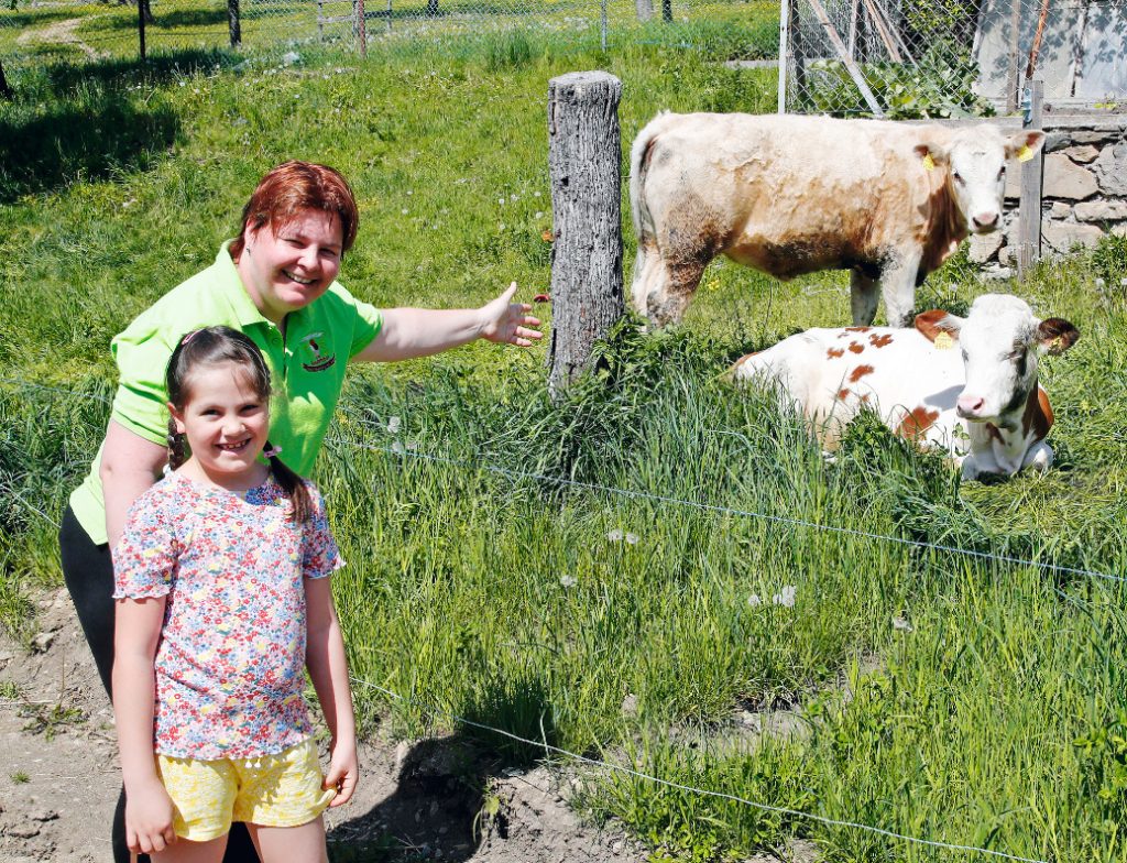 Kinderreporterin Jasmin, 8, besuchte für „familiii“ gemeinsam mit ihren Eltern und ihrem Bruder den Milchbauernhof von Petra Pobaschnig (li.) in Kärnten.