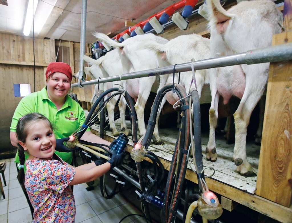 Für das Melken der Ziegen gibt es eine eigene Melkstation. „Ich durfte die Melkmaschine an die Ziegeneuter anstecken. Die geben bis zu 5 Liter Milch bei einmal Melken!“