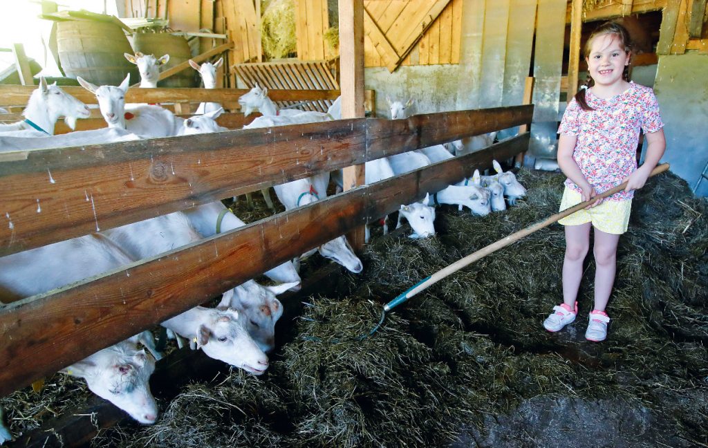 Ziegenfütterung: 50 Milchziegen gibt es bei den Pobaschnigs. Jasmin: „Ich durfte beim Füttern helfen. Mit der Heugabel habe ich sehr aufpassen müssen, damit ich sie nicht steche.“