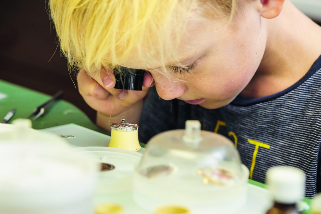 Der Uhrmacher hat mir seine Lupe geborgt und ich konnte mir die vielen kleinen Teile der Uhr ganz genau ansehen.