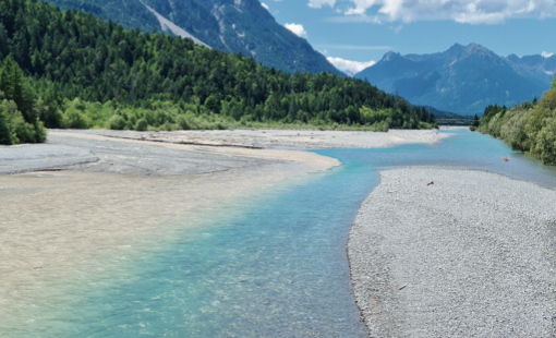 Zwischen Stanzach und Weißenbach mäandert der Lech so stark, dass seine Arme aussehen wie türkisblaue Zöpfe. Die Schotterbänke sind ein Paradies für seltene Vögel.